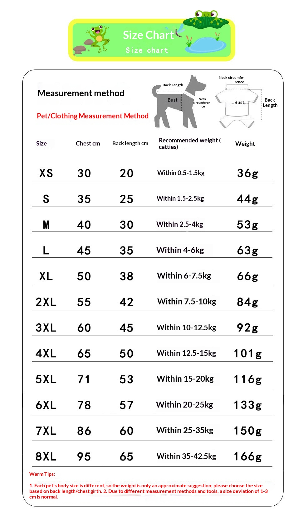 Size: XS (chest circumference 30cm 0.50kg-1.50kg,S (chest circumference 35cm 1.50kg-2.50kg,M (chest circumference 40cm 2.50kg-4.00kg,L (chest circumference 45cm 4.00kg-5.50kg,XL (chest circumference 50cm 5.50kg-7.50kg,2XL (chest circumference 55cm 7.50-10.00, 3XL (chest circumference 60cm 10.00kg-12.50kg,4XL (chest circumference 65cm 12.50kg-15.00kg,5XL (chest circumference 71cm 15.00kg-20.00kg,6XL (chest circumference 78cm 20.00kg-27.50kg,7XL (chest circumference 86cm 27.50kg-35.00kg,8XL (chest circumference 95cm 35.00kg-42.50kg